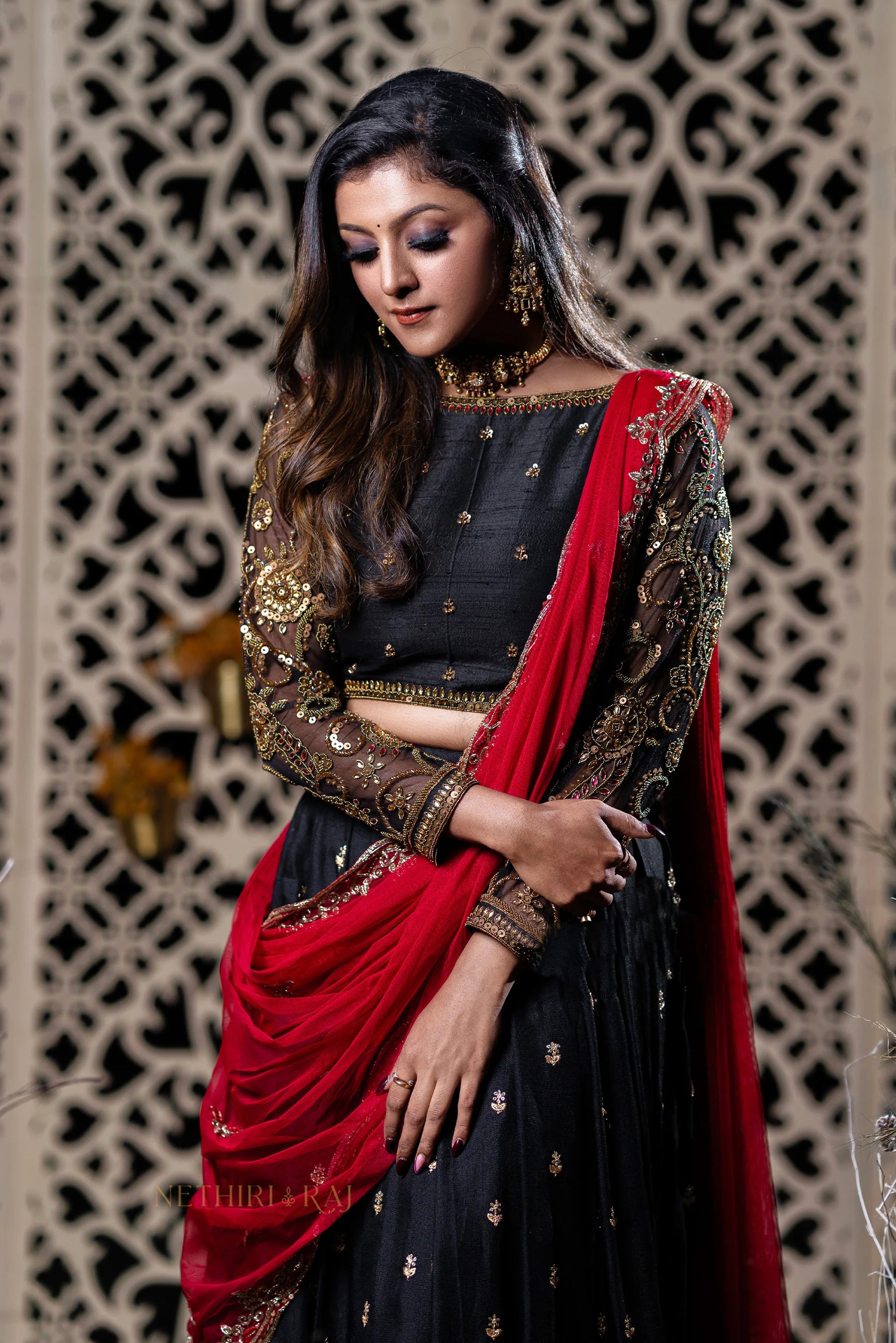 Take a traditional route to fashion with this stunning Black Lehenga . Raw silk embroidered blouse with fully embellished net sleeves is surely a royal retreat . Paired up with a Jute silk skirt finished with a wide red zari border for a classy touch . The dupatta has an enticing embellished border.