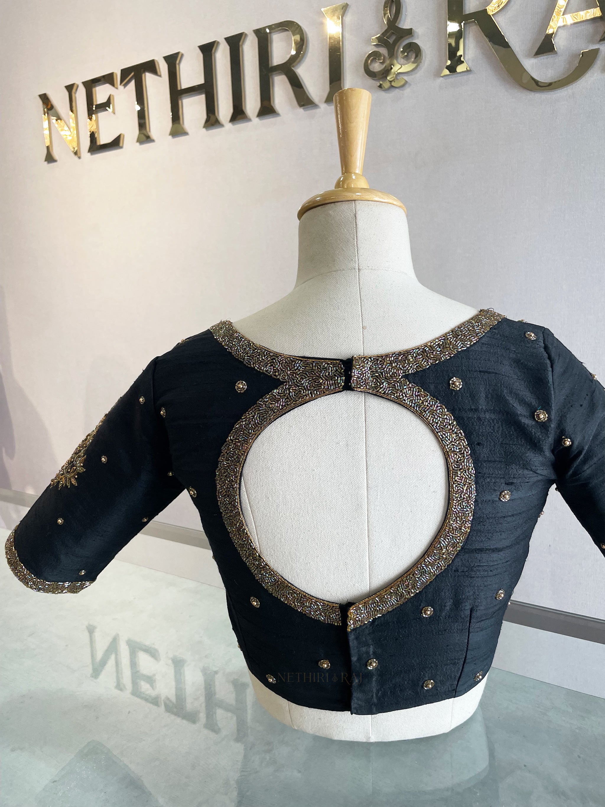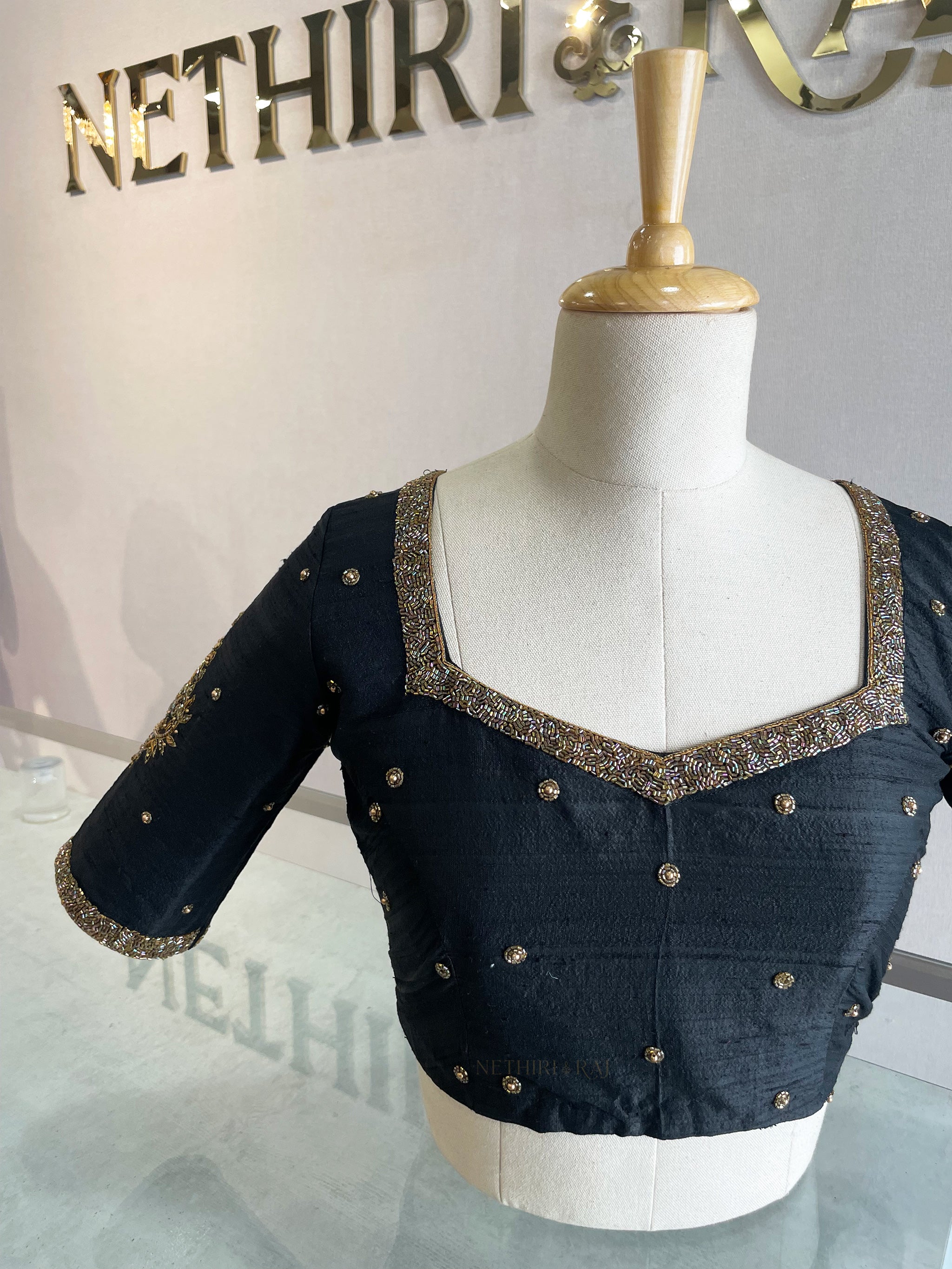 Made from the finest black raw silk, this blouse features golden hand embroidery that adds a touch of elegance to any outfit. Elevate your wardrobe with this exclusive piece.