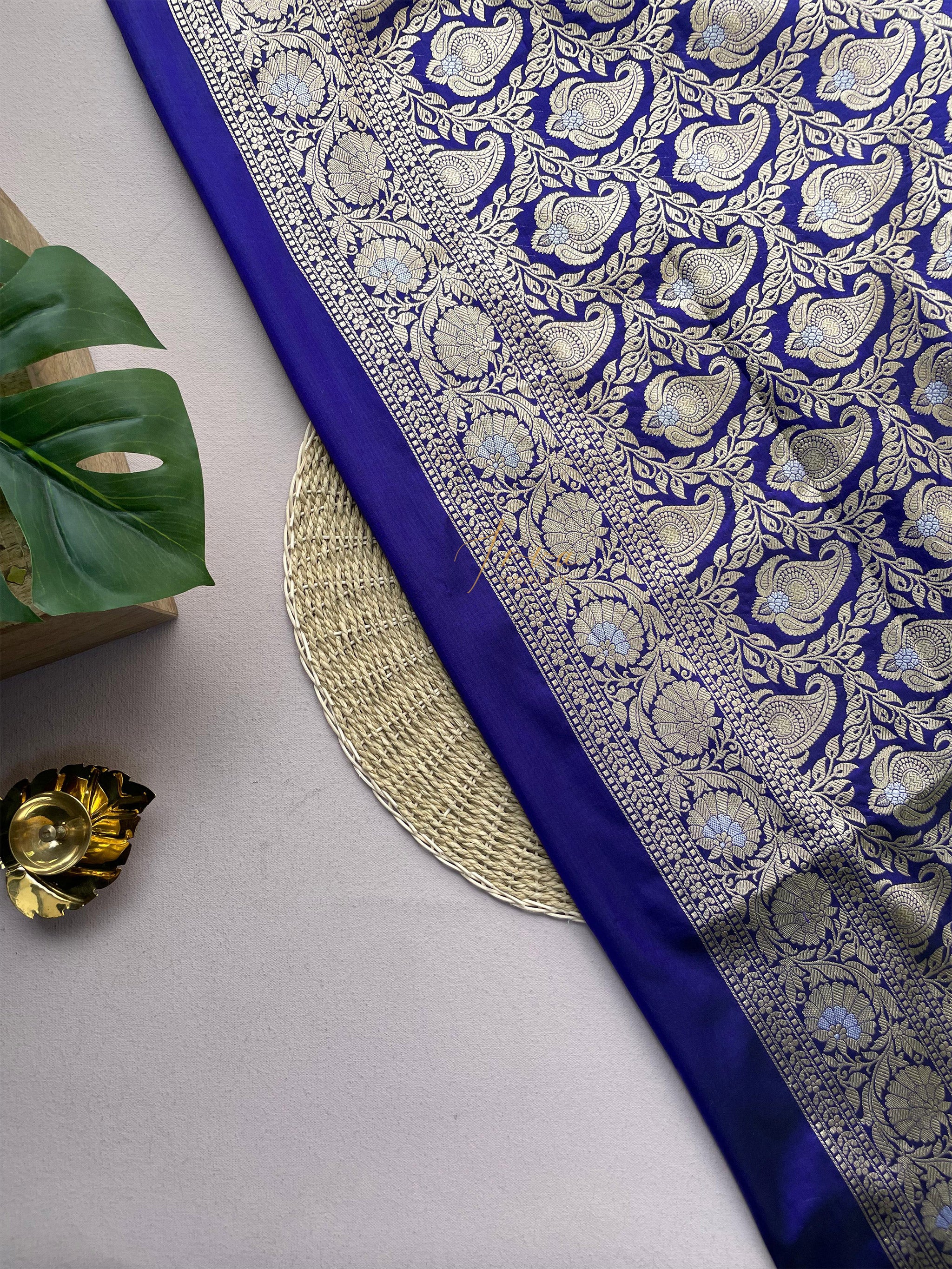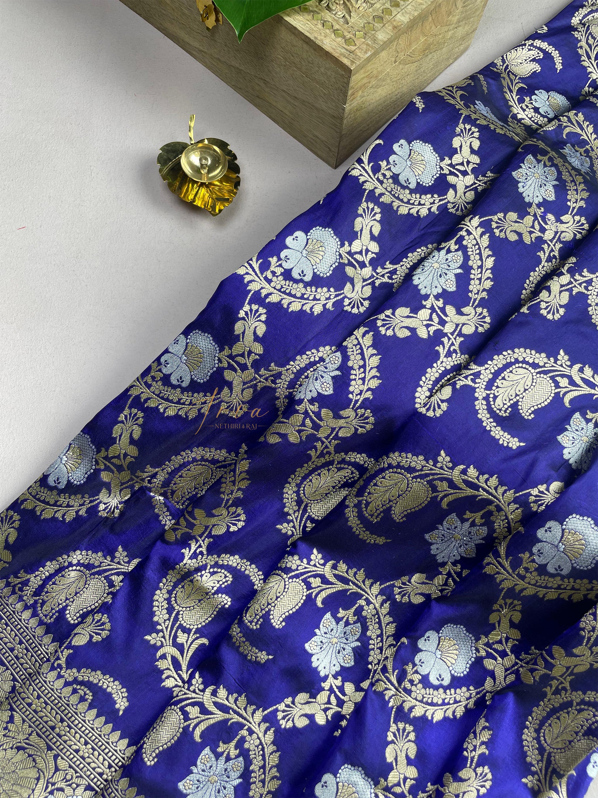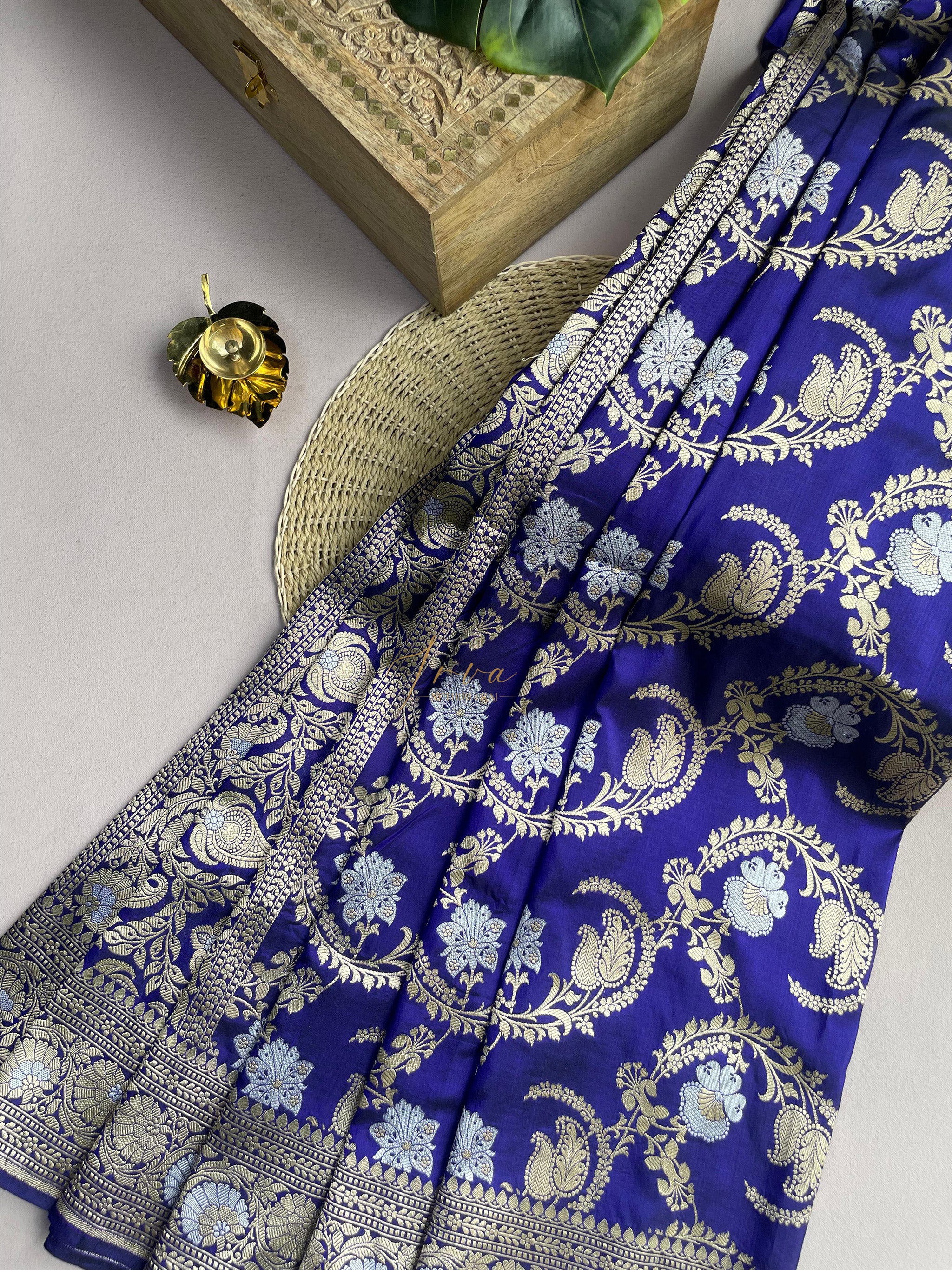 Woven with rich Banaras silk, this saree exudes sophistication and grace. The intricate weaving and rich blue hue evoke a sense of royalty and exclusivity, making it the perfect addition to your wardrobe.