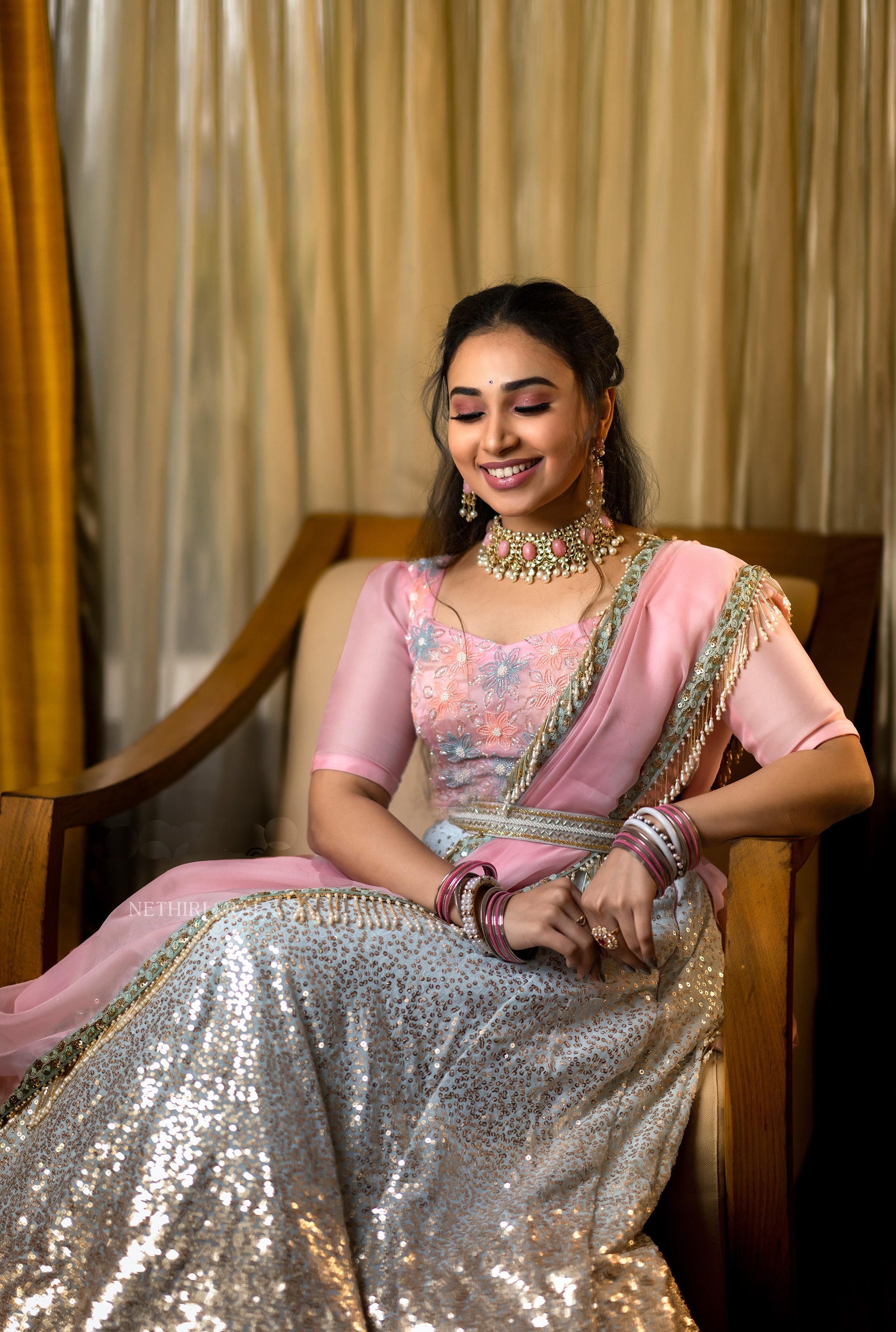 Intricately embroidered floral blouse in variegated colors is beautifully set into in this ice blue and baby pink lehenga. Crafted with luxury, the sequins skirt is coupled with a waist belt and pink organza dupatta crafted in thread work and hangings. This ensemble is a perfect pairing of traditional craftsmanship on a contemporary silhouette.