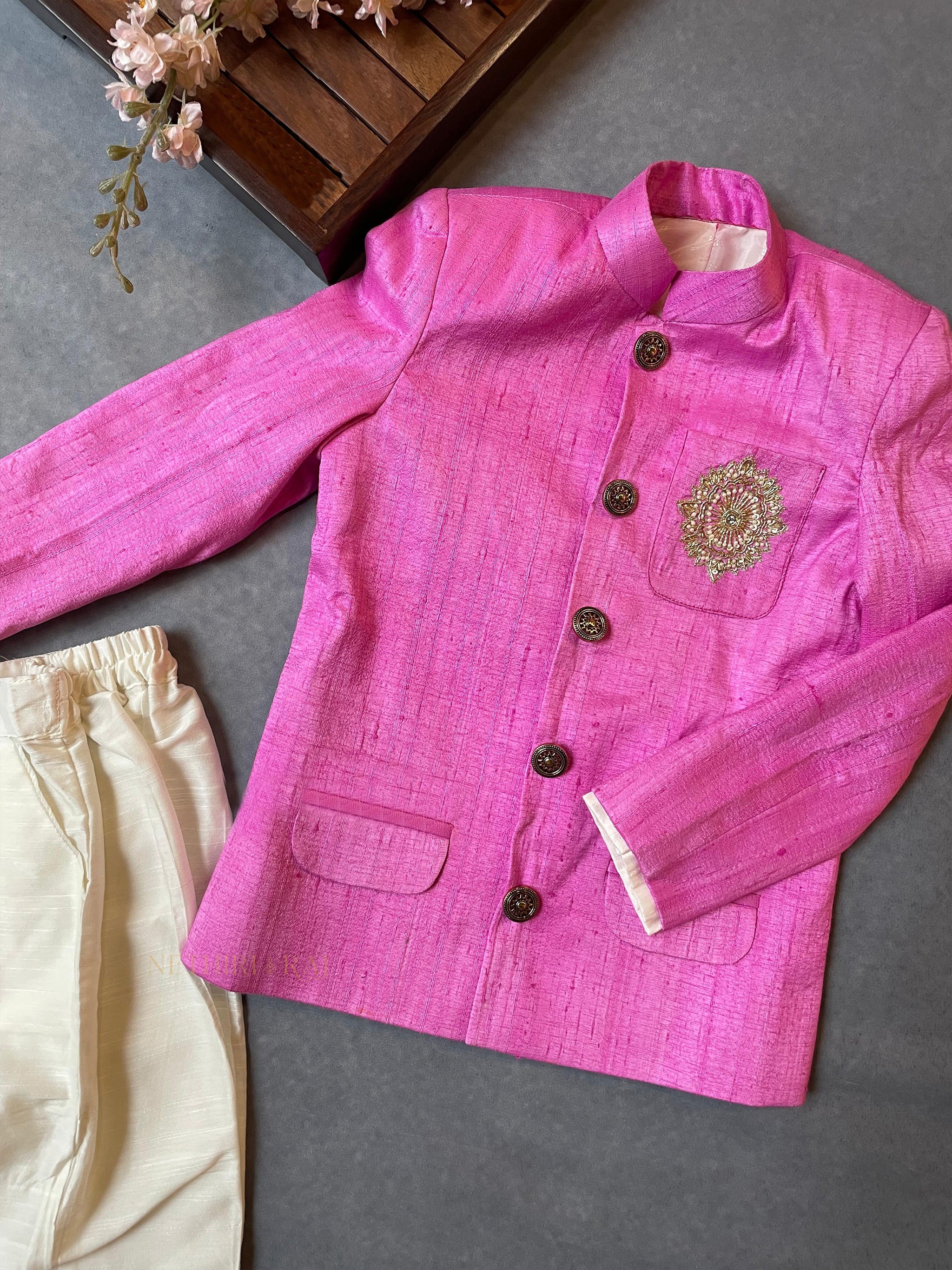 Elevate your little one's style with our boys' pink embroidered sherwani with ivory straight pants . Featuring intricate embroidery and a luxurious pink color, this set exudes sophistication and exclusivity. Perfect for special occasions, this set is sure to make your child stand out in the most elegant way.