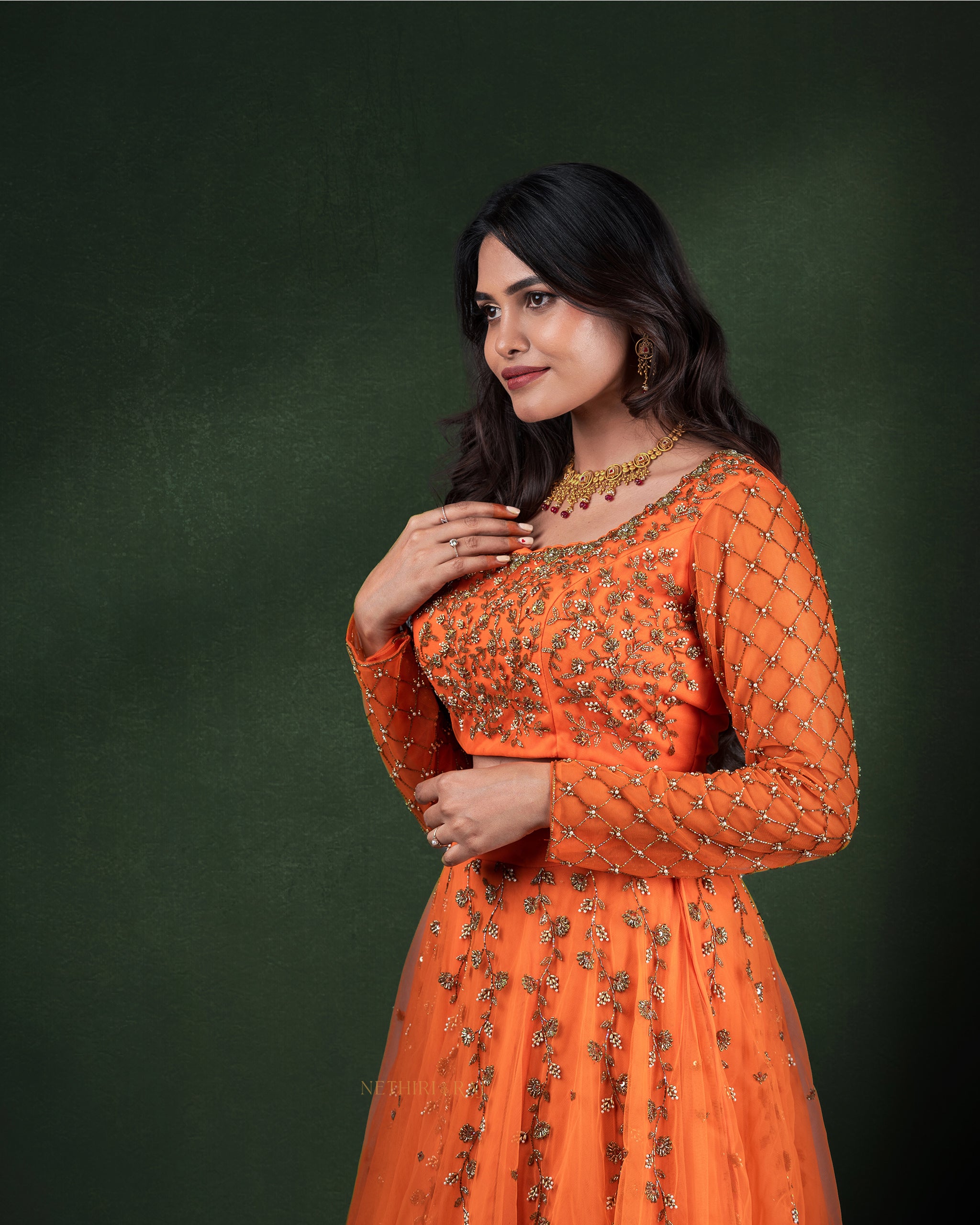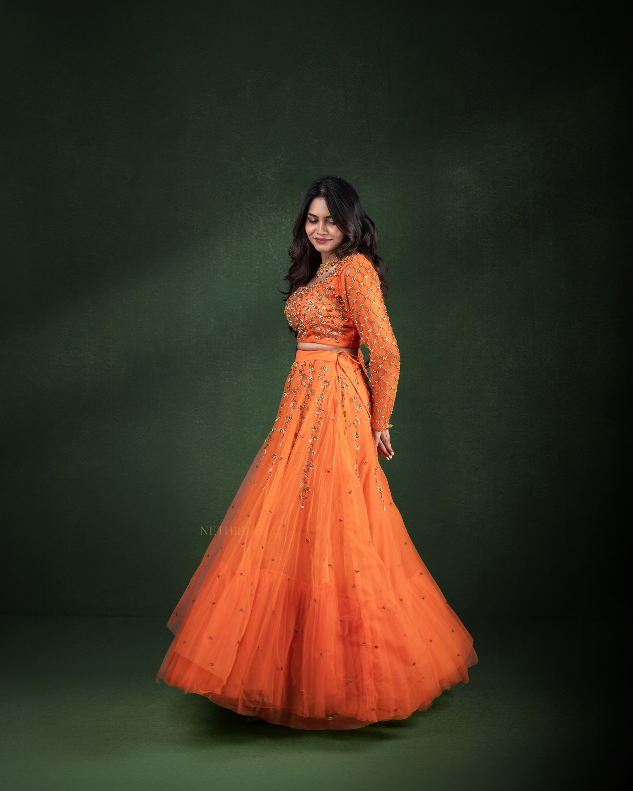 Indulge in our customizable bright orange floral creeper net lehenga. Crafted with intricate details and adorned with a vibrant floral design, this piece is perfect for making a statement at any occasion.