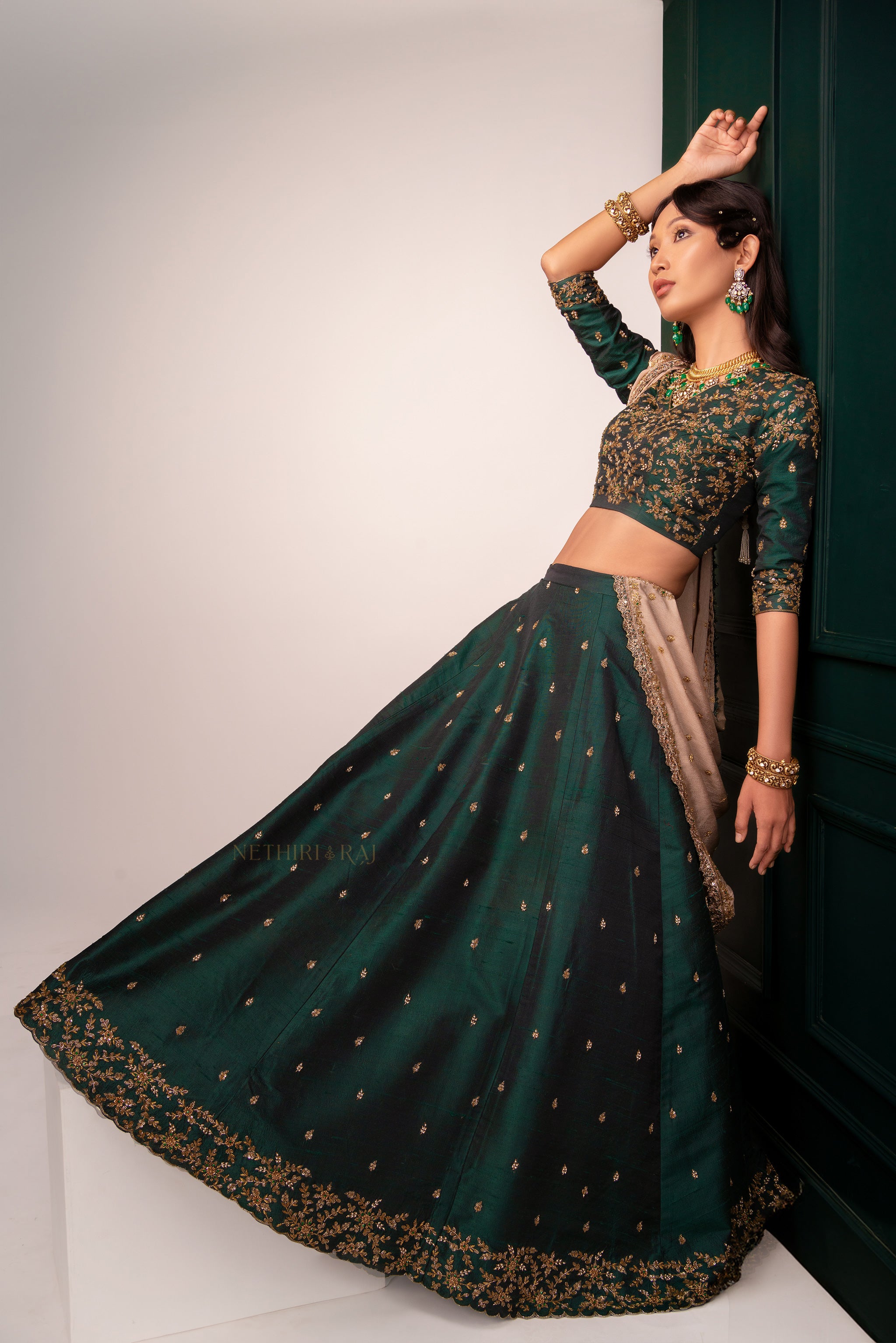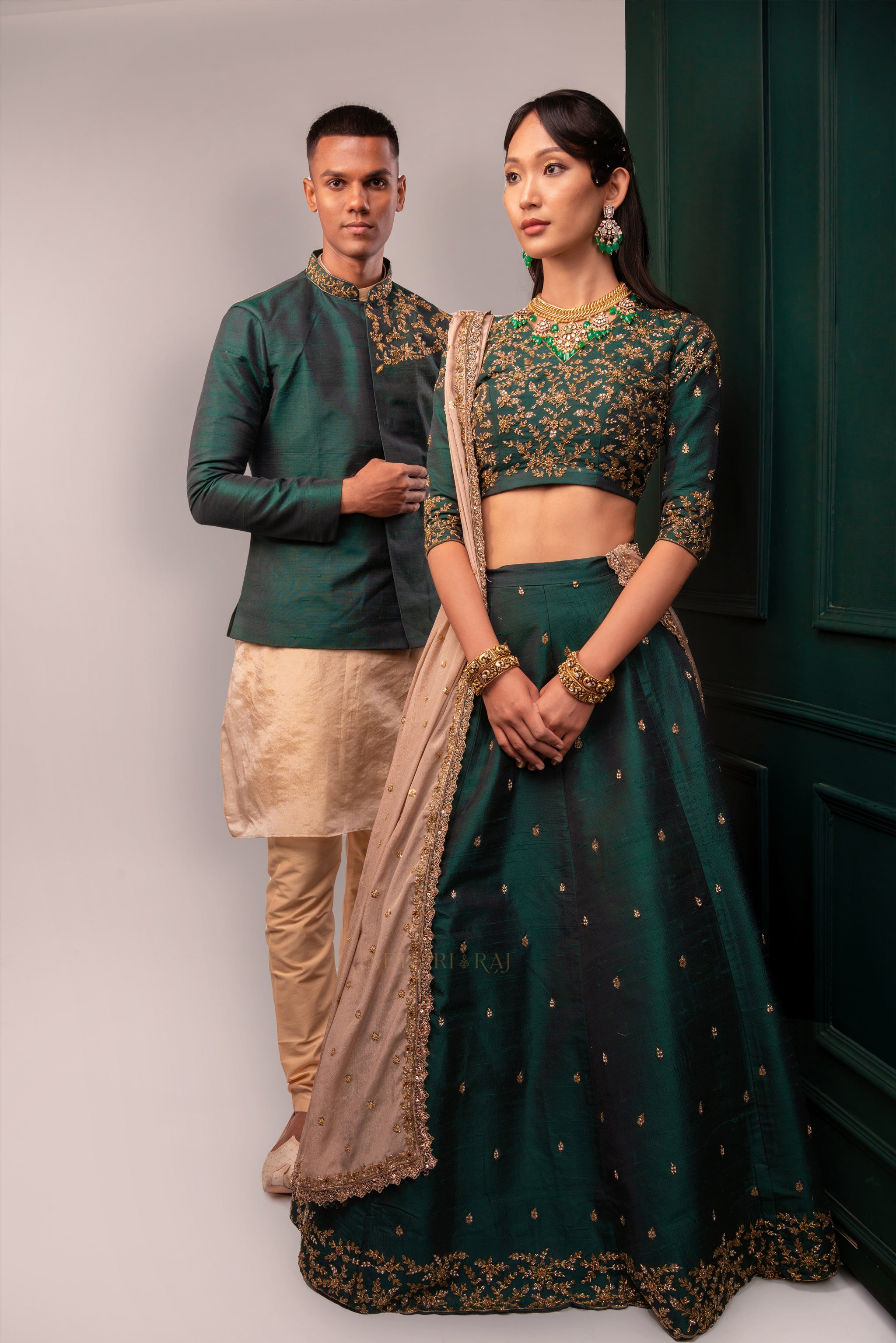 Indulge in luxury with our deep green raw silk lehenga paired with a golden silk dupatta. Made from premium raw silk, this elegant piece exudes sophistication and exclusivity. Elevate your style and embrace the beauty of fine craftsmanship with this stunning lehenga.