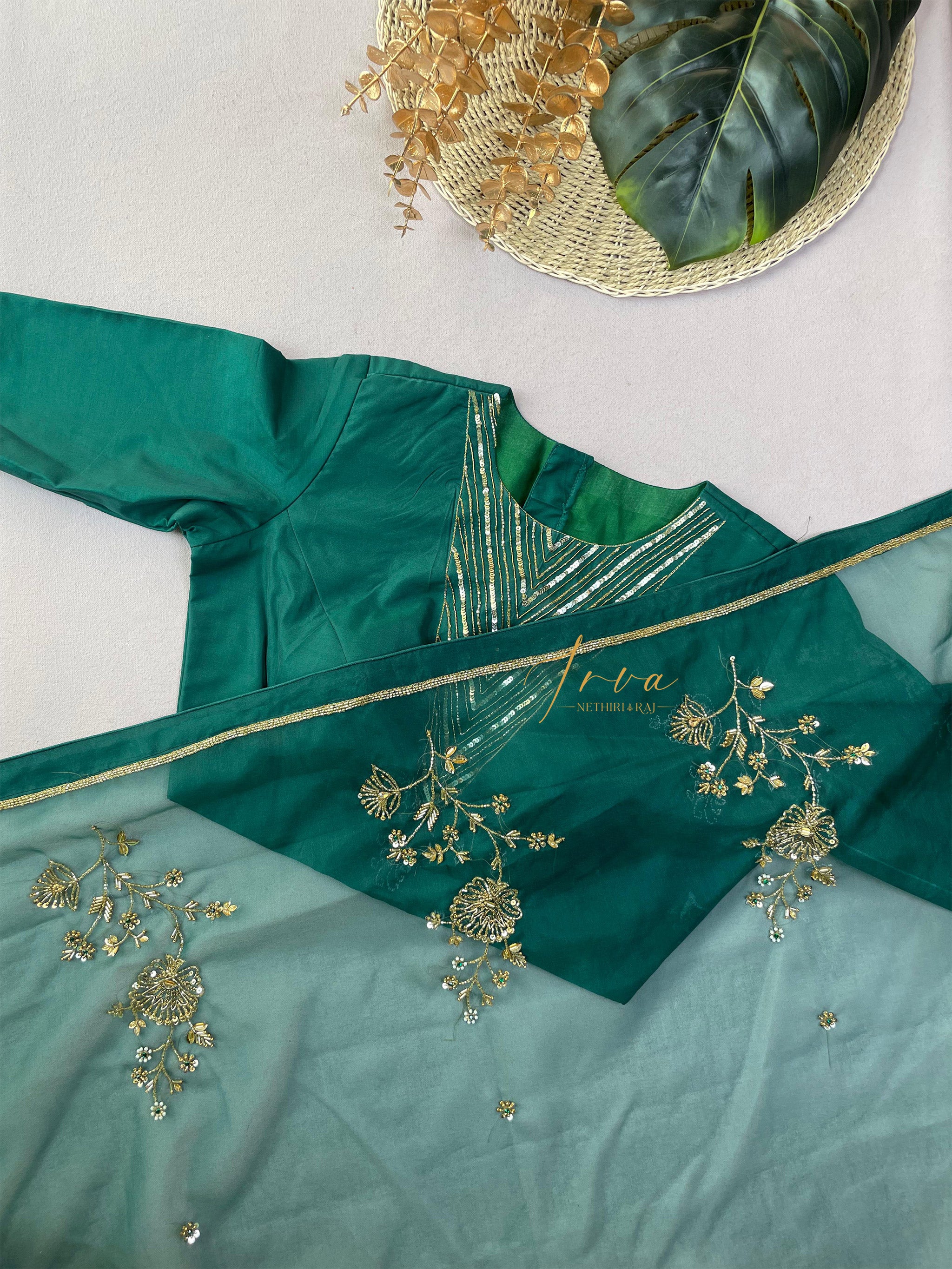 Add a touch of elegance with our exquisite green embroidered organza saree. The intricate detailing and premium quality fabric create a truly exclusive piece of art. This saree comes with a matching blouse for a complete and elegant look.