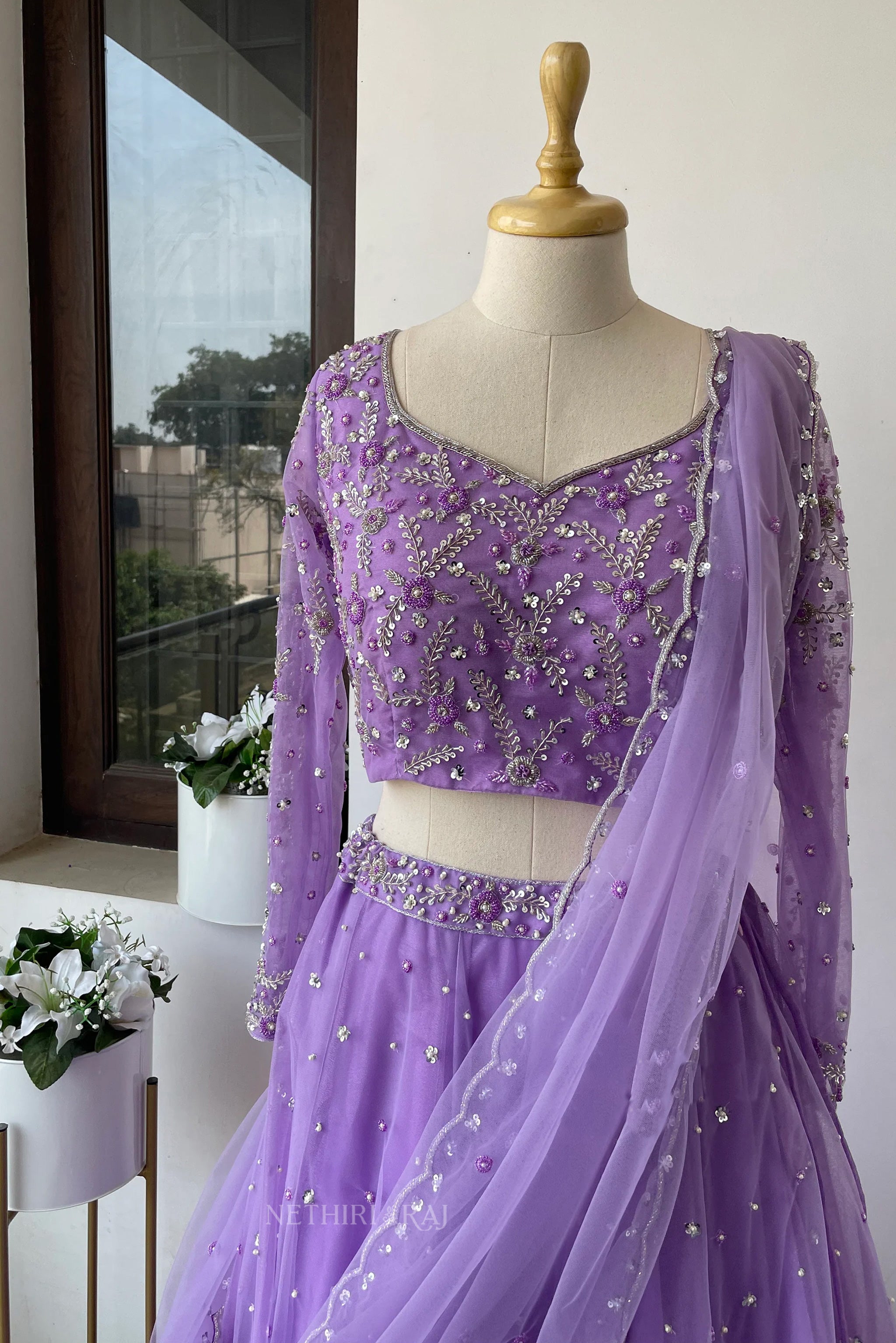 Grab all the attention wearing this gorgeous Lavender lehenga. Beautifully embellished with silver zardozi, sequins and thread work. Pair it up with our signature exquisitely worked scallop border dupatta.