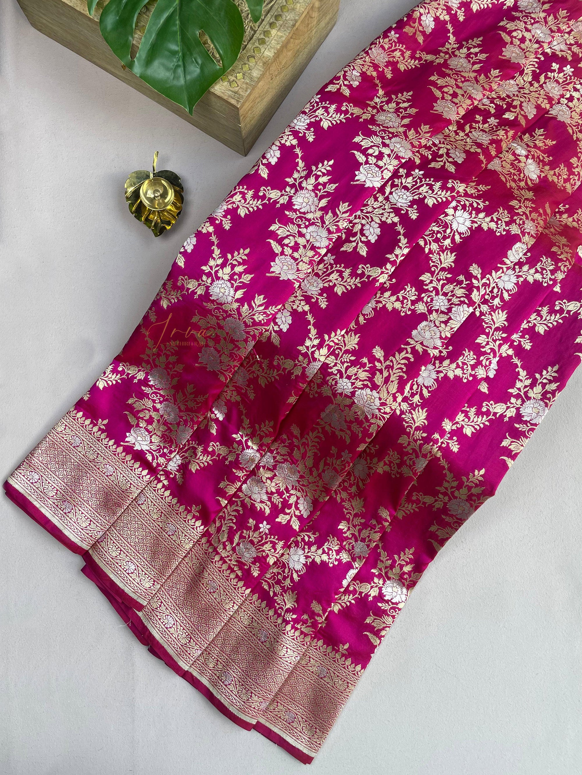 Wrap yourself in elegance with our pink Banaras saree. Made from luxurious Banaras fabric, this saree features a delicate shade of pink that will enhance your natural beauty. Perfect for any special occasion, this saree is a must-have for any fashion-forward individual.