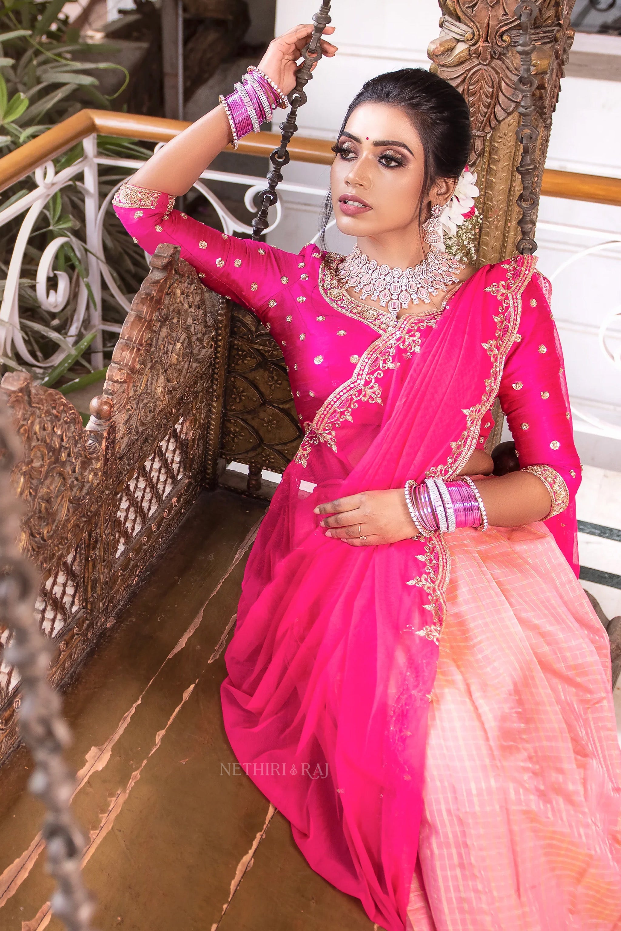 A charming yet traditional look is achieved with this bright Pink lehenga set. The embellished silk blouse and net dupatta is paired with a light pink pleated skirt for a heritage touch. Grab yours to steal the show.