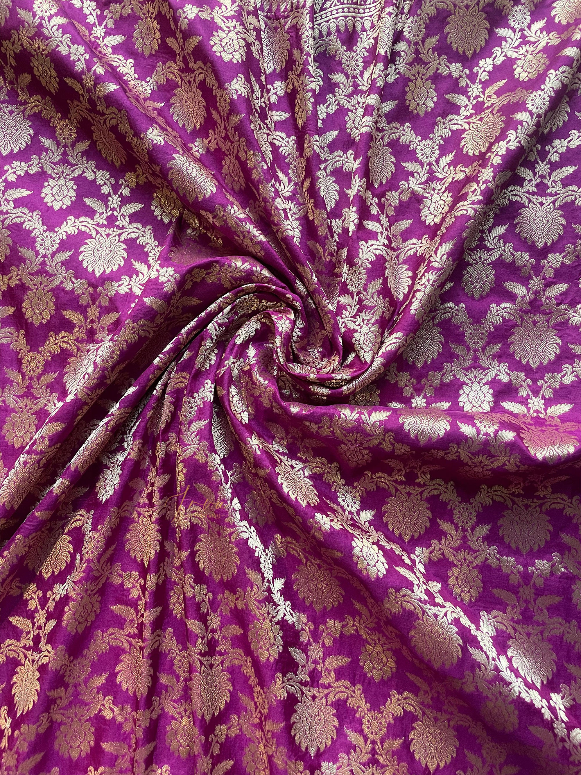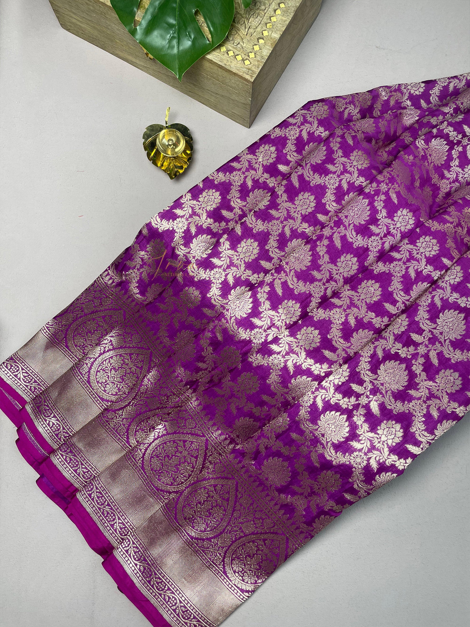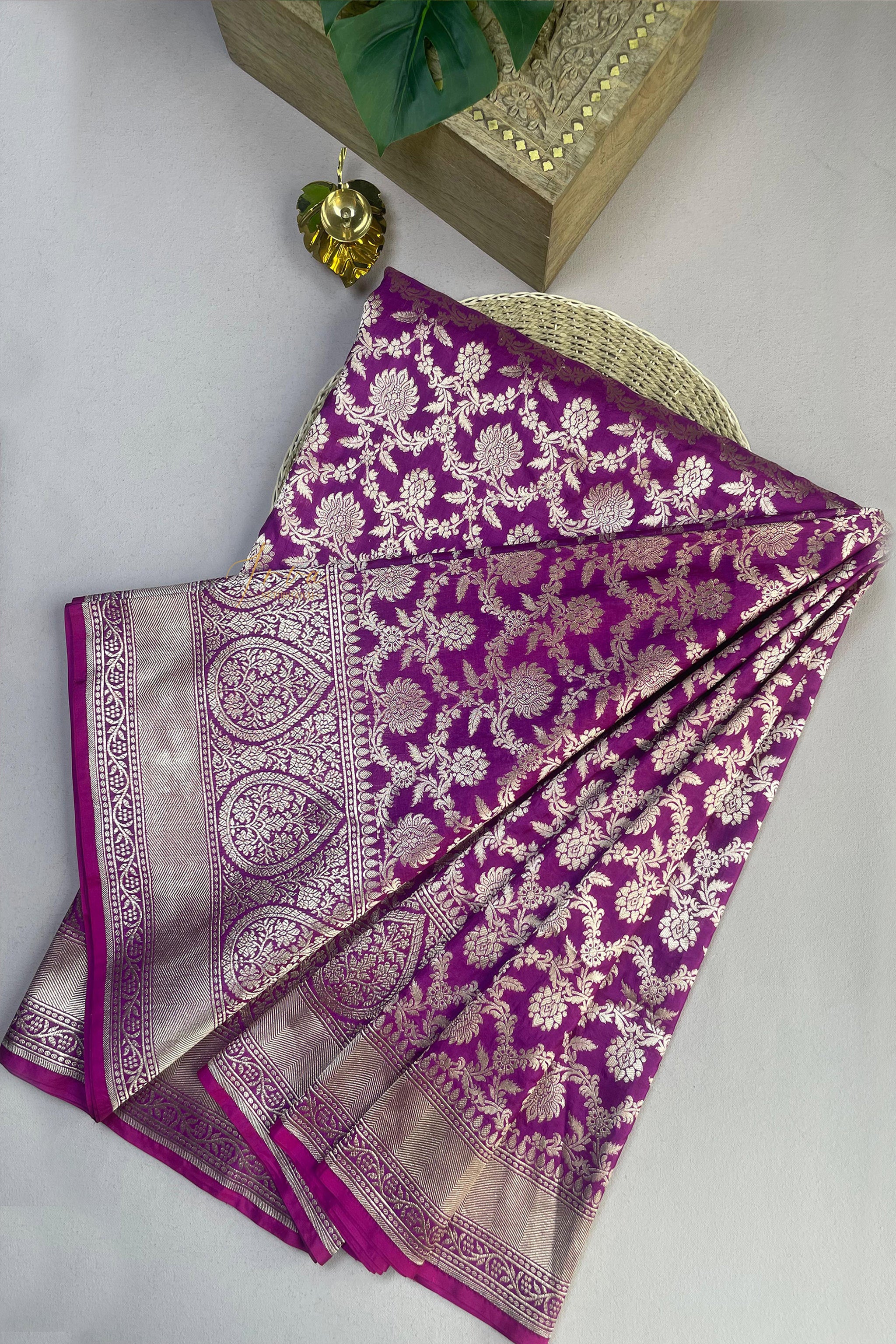 Introducing the exquisite grape purple Banaras saree, crafted with the finest Banaras silk and intricate zari work. Elevate your style with this luxurious piece, perfect for special occasions and events. Experience the grandeur and confidence that comes with wearing a saree like this.