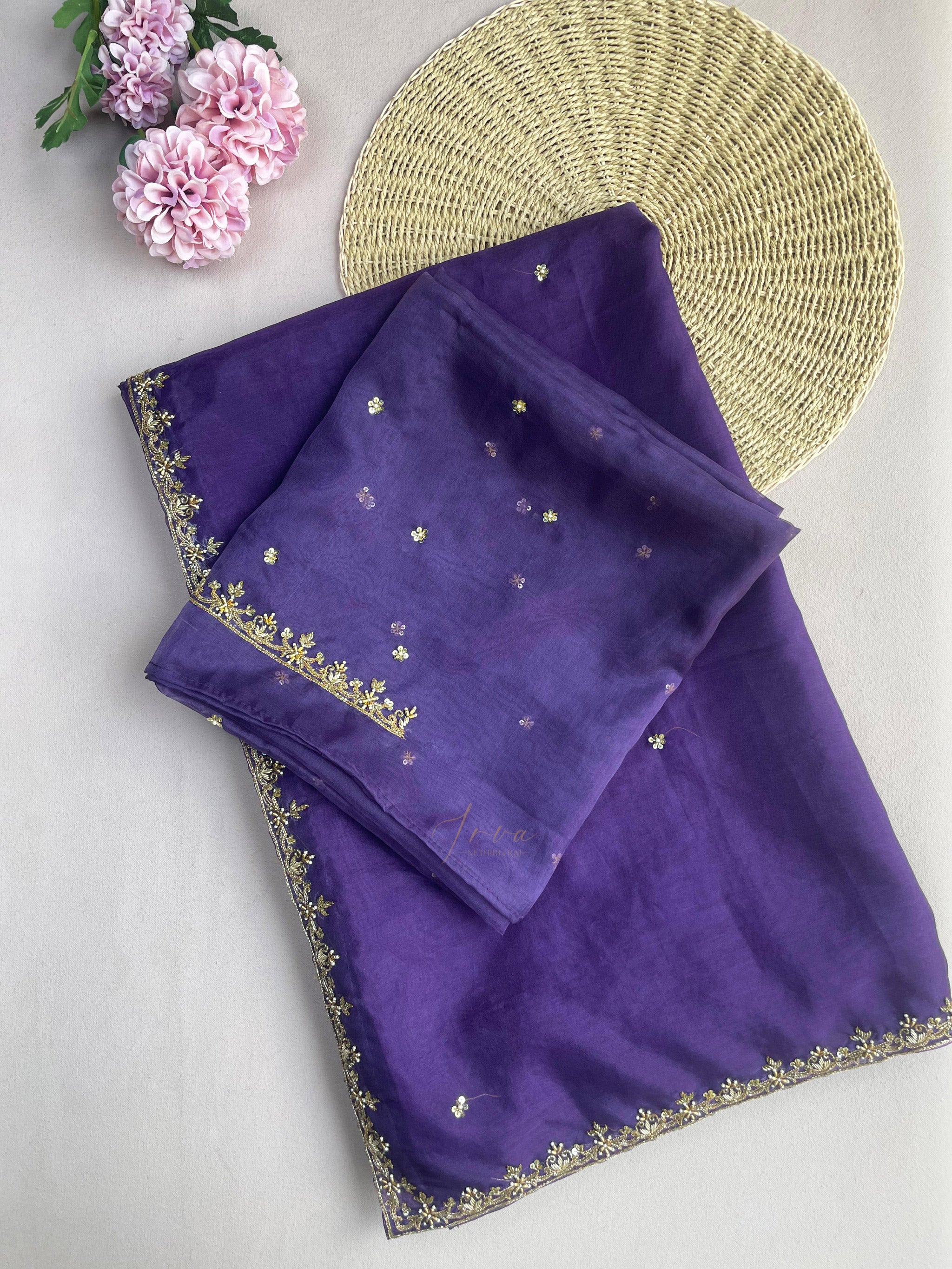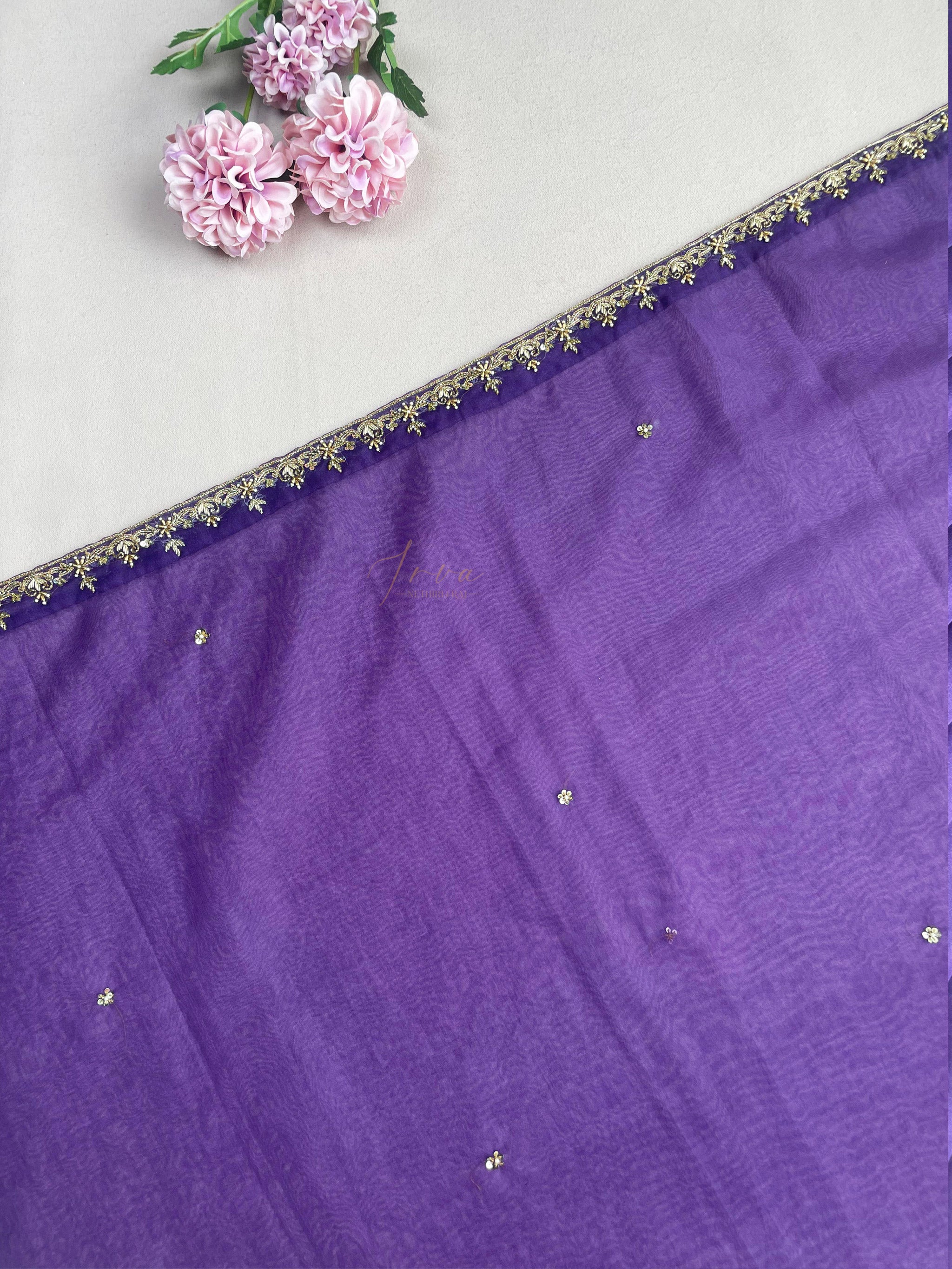 Wrap yourself in luxury and beauty with our Purple Organza Saree. Crafted in exquisite organza fabric, this saree features stunning golden highlights that add a touch of elegance and glamour. Perfect for special occasions, this saree will make you stand out in the most sophisticated and exclusive way.