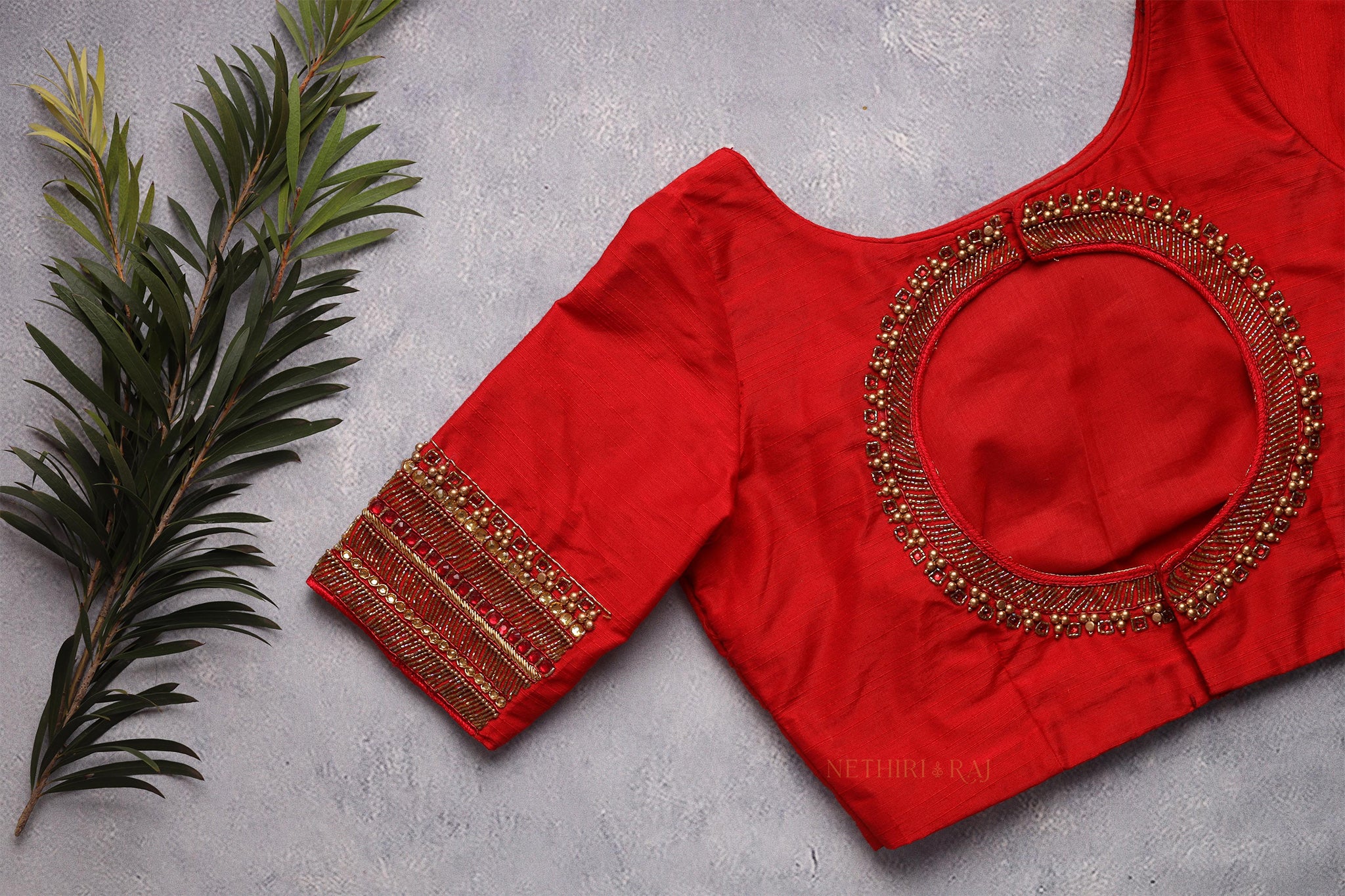This luxurious blouse features intricate red kundan embroidery on silk, creating a stunning and elegant look. Made with high-quality materials, this blouse is not only stylish but also durable.