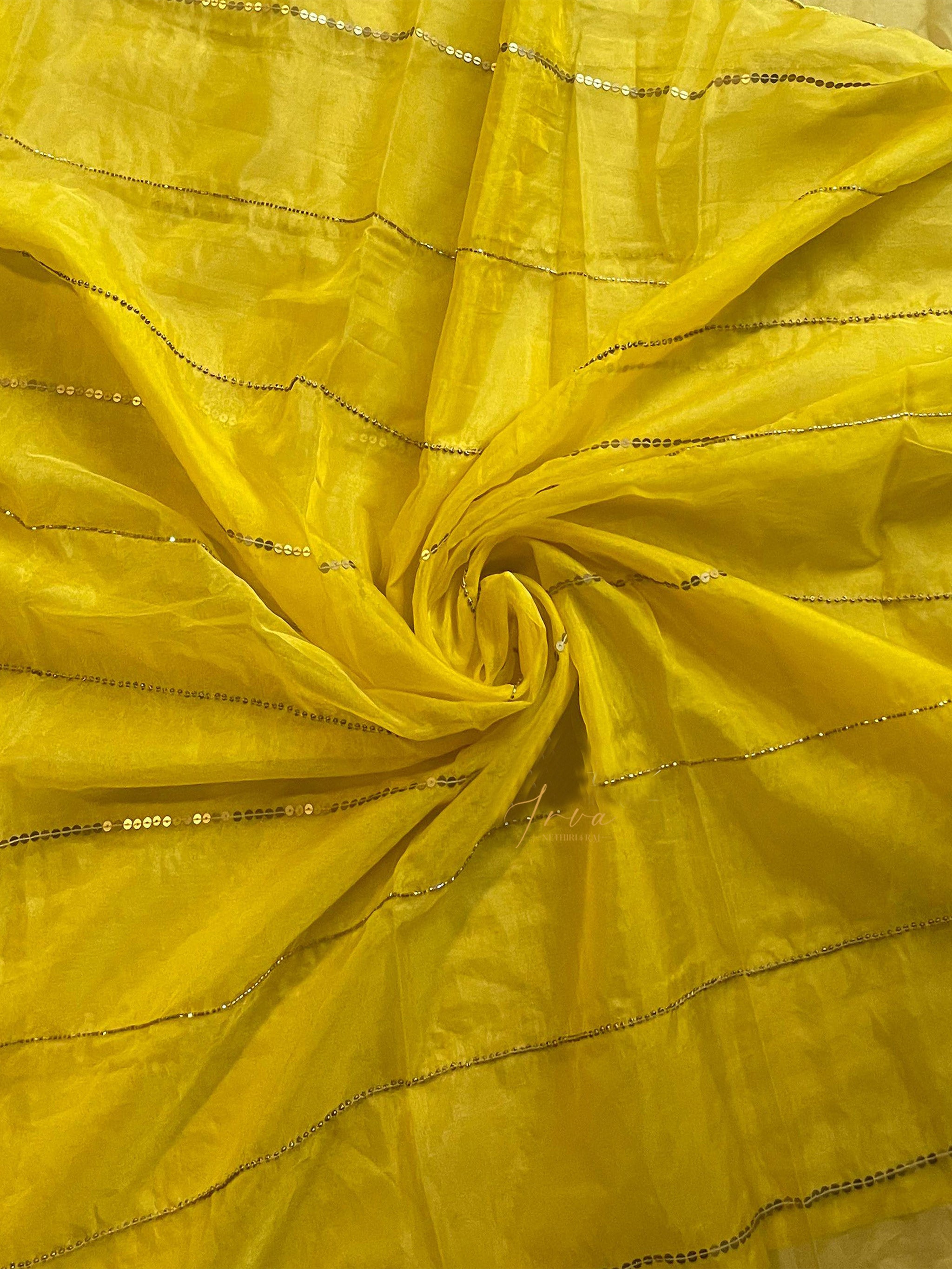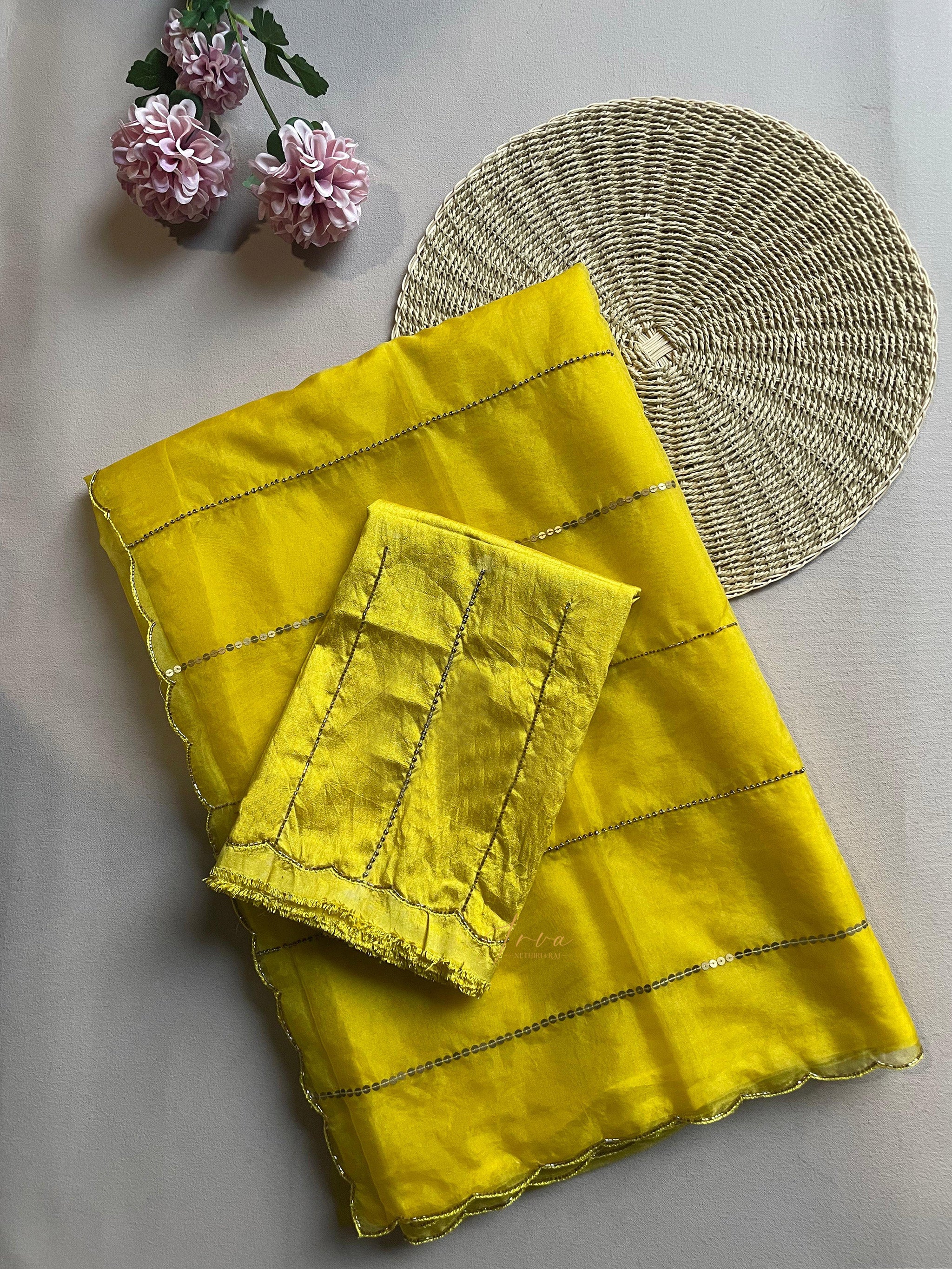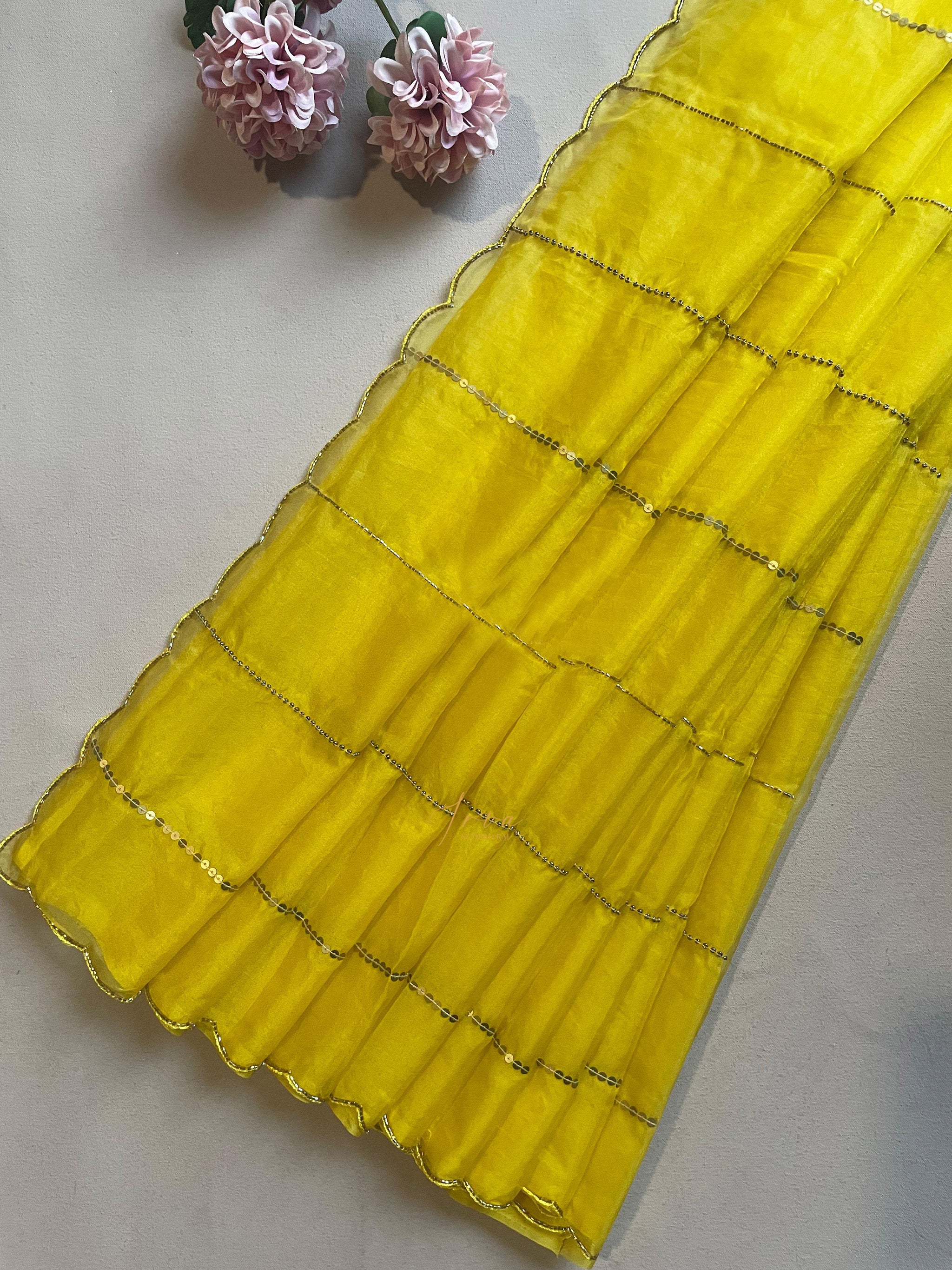 Indulge in the opulence of this exquisite Yellow Organza Worked Saree. The lightweight and delicate organza fabric drapes gracefully, while the intricate work adds a touch of elegance. Elevate your wardrobe with this premium saree.
